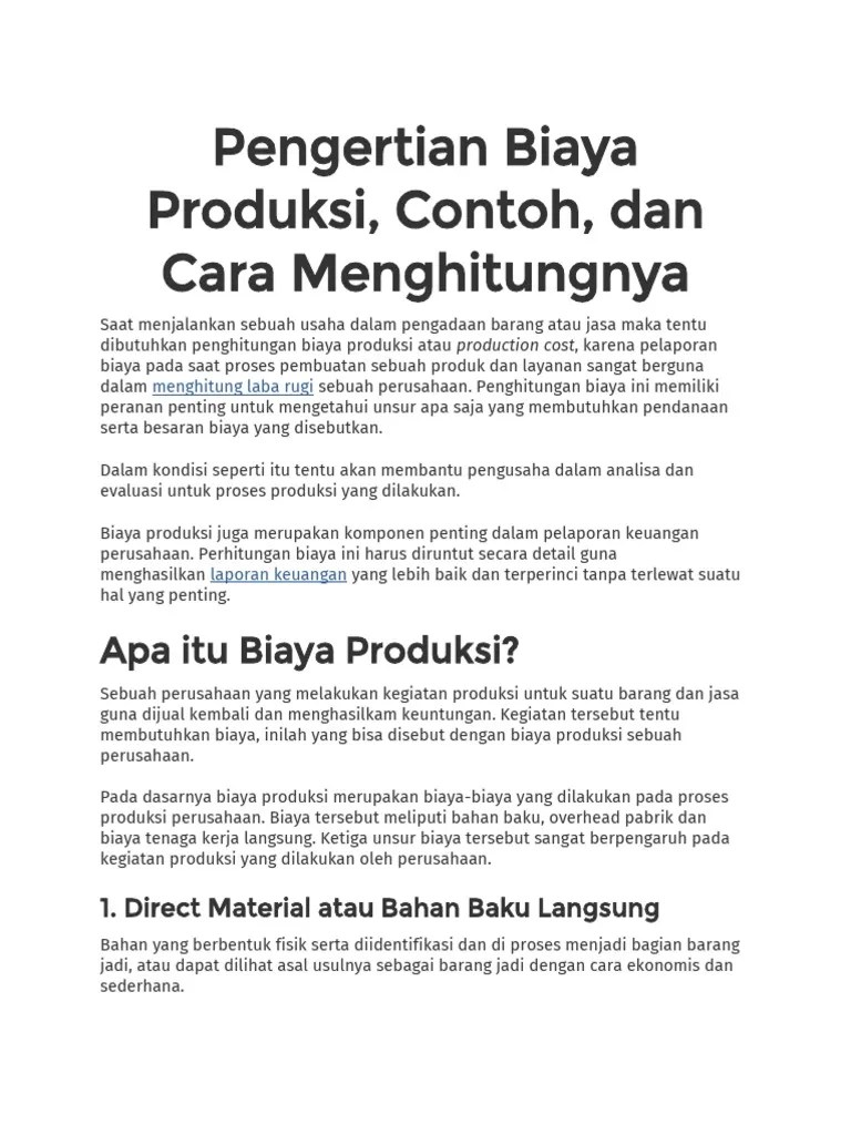 Berikut ulasan terkait biaya produksi tersebut mulai dari pengertian, contoh, cara menghitung, dan unsurnya. Di zaman yang serba mahal ini biaya produksi memang perlu ditekan. 12.08.2021 · dalam operasional bisnis, pengertian biaya produksi adalah sejumlah dana yang dikeluarkan oleh perusahaan dalam rangka melakukan pengolahan dan produksi bahan baku demi terciptanya suatu produk. Perhitungan biaya produksi terbilang cukup kompleks karena banyak sekali … 12.11.2021 · jul 30, 2020 · biaya produksi harus dihitung sejak awal.